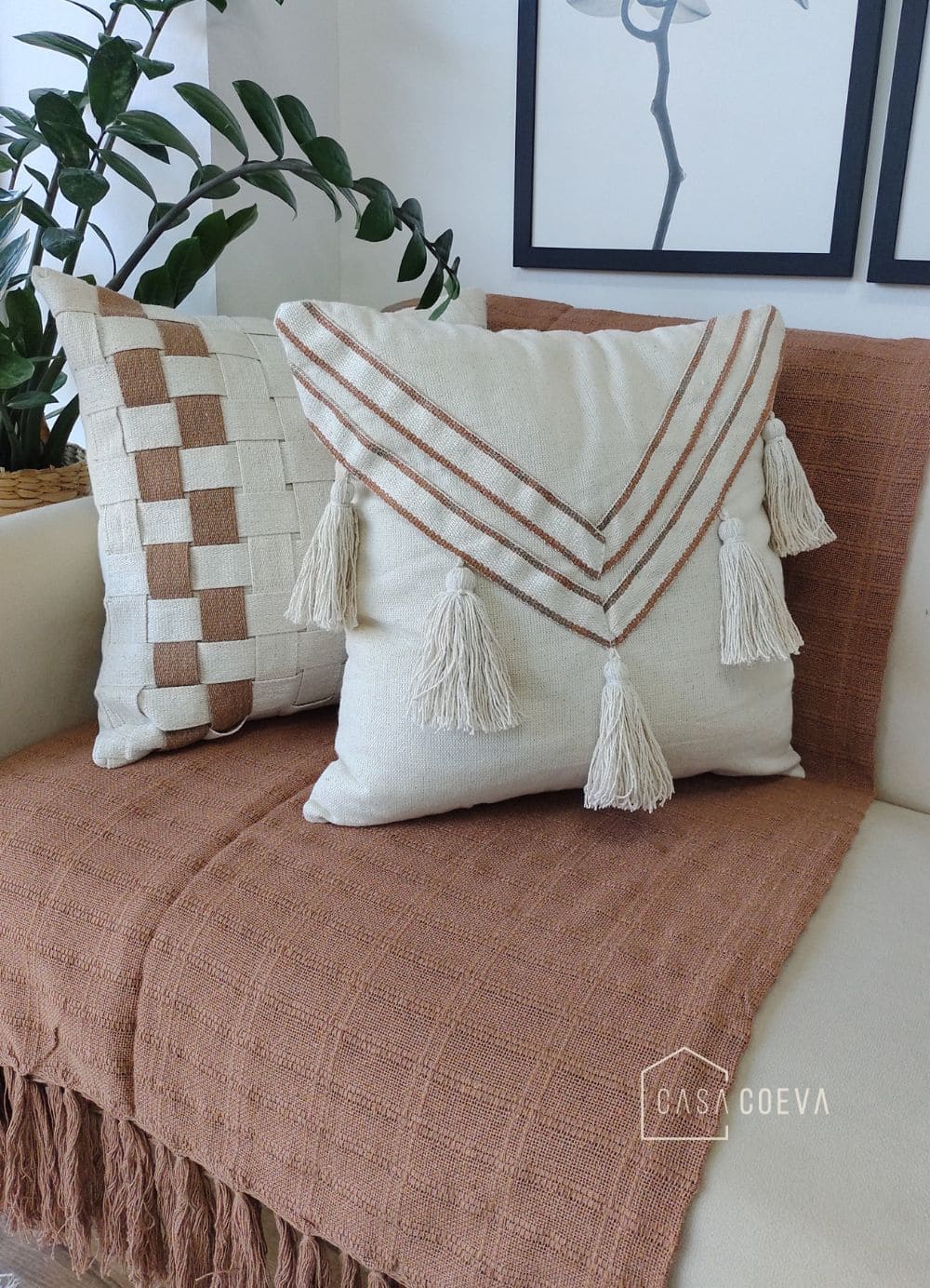 Cada almofada reflete a maestria dos designers da Casa Coeva, com uma trama geométrica que convida ao toque e pingentes que adicionam um charme único. Feitas à mão com tecido 100% algodão, elas oferecem um toque macio e um acabamento impecável, enquanto o enchimento macio garante suporte e durabilidade. O design contemporâneo com detalhes rústicos combina perfeitamente com decorações boho, modernas ou minimalistas, criando uma atmosfera de serenidade e calor.