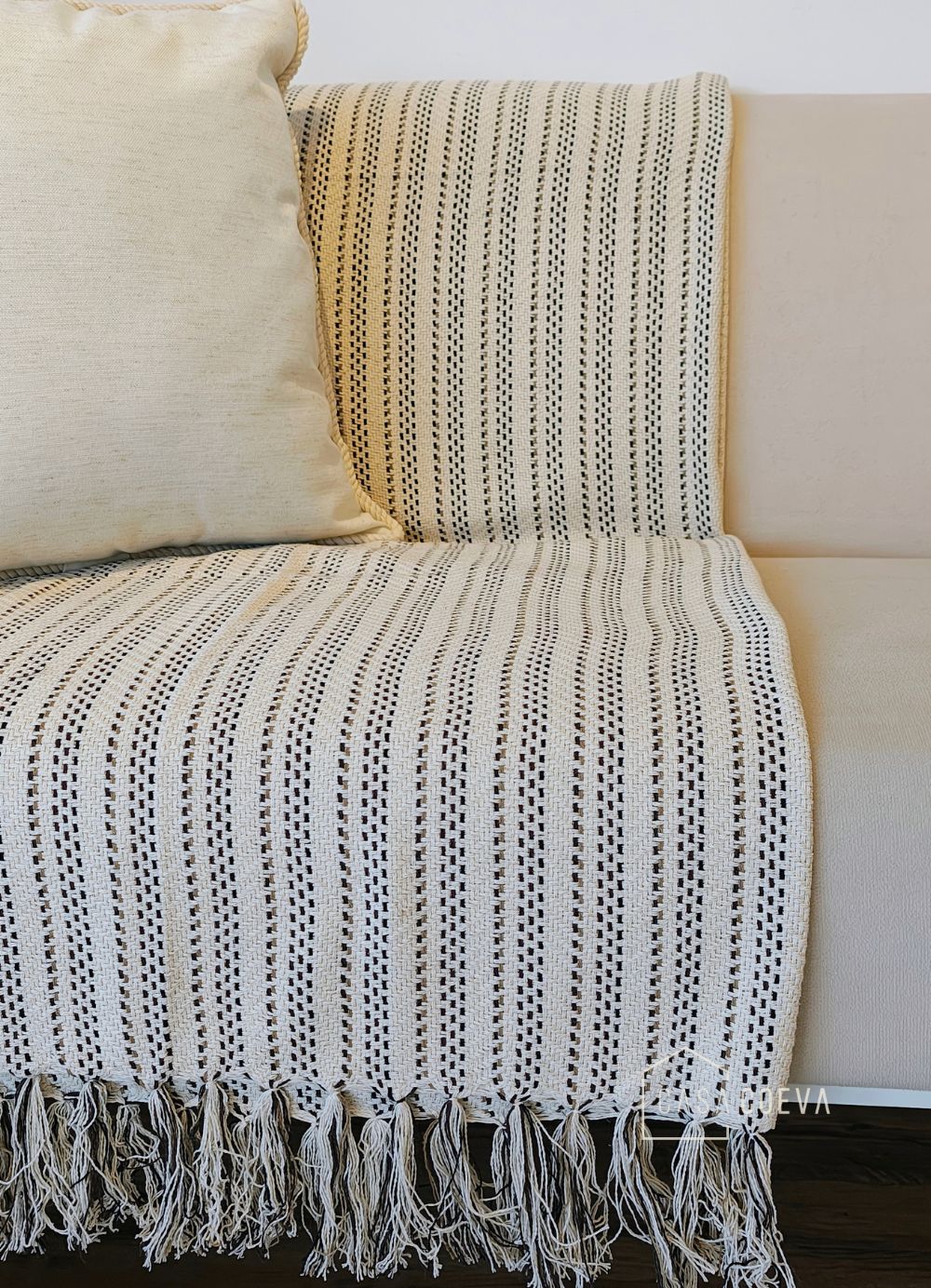 O padrão listrado, uma característica marcante da peça, é formado por uma trama que combina tons neutros, como o off-white e um tom mais escuro, criando um visual moderno e ao mesmo tempo orgânico. As listras são entremeadas por pontos que formam um desenho texturizado, proporcionando um toque visual e tátil único. As extremidades da manta são finalizadas com franjas, que adicionam um movimento e charme extra ao design.