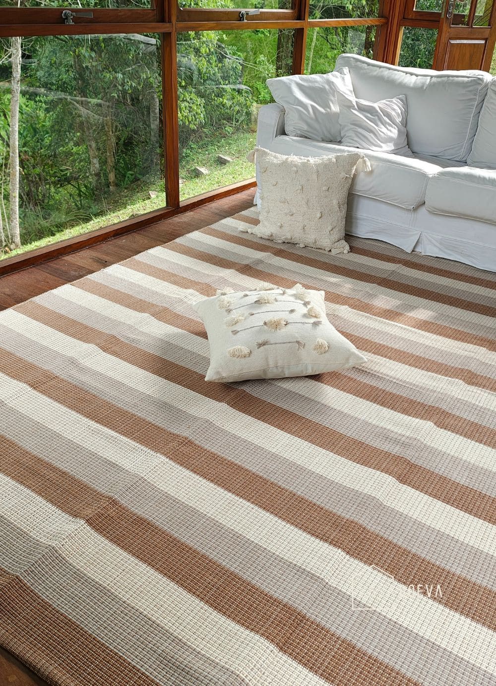Feito com tiras em cru e argila em trama 100% algodão, ele é perfeito para salas de estar, quartos e até aquele cantinho de leitura especial. Uma peça leve, dupla face e cheia de personalidade, pronta para transformar qualquer espaço com seu visual natural e contemporâneo.