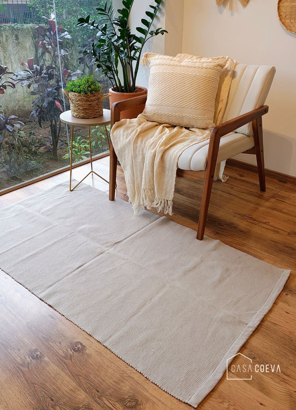 Tecida à mão em tear manual com fios de algodão 100% natural, essa peça possui uma espessura mais fina perfeita para espaços que pedem leveza visual sem abrir mão da textura e da presença. Sua tonalidade nude traz um toque neutro e atemporal, que combina com todos os estilos de decoração, do escandinavo ao rústico moderno.